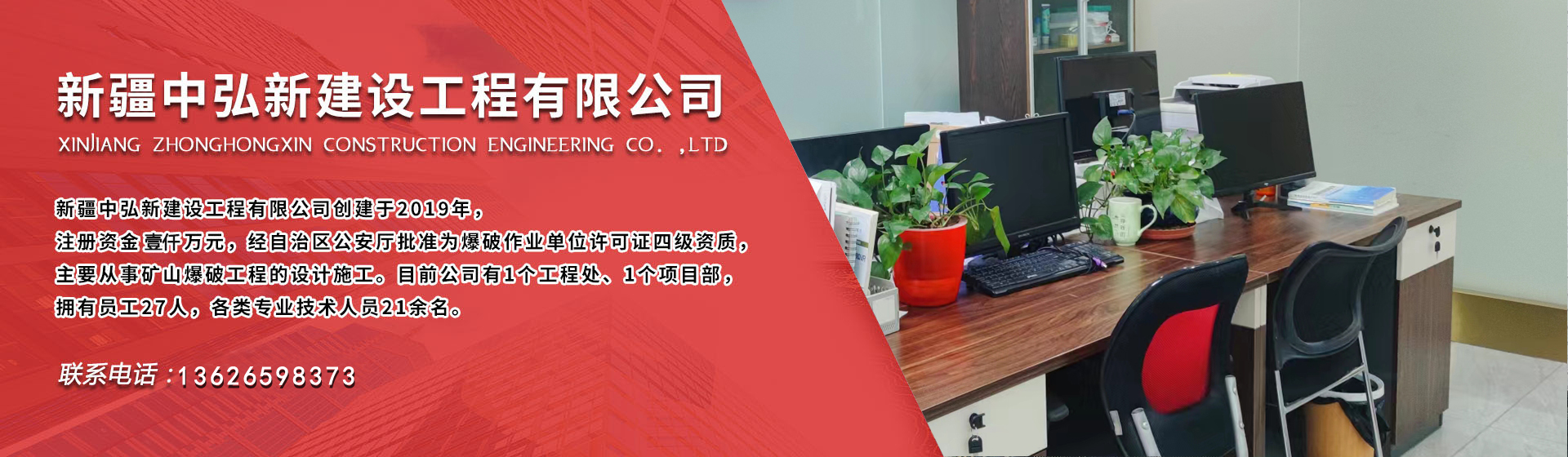 ZHONGHONGXIN CONSTRUCTION ENGINEERING   公 司 簡 介新疆中弘新建設(shè)工程有限公司創(chuàng)建于2019年,注冊資金壹仟萬元,經(jīng)自治區(qū)公安廳批準(zhǔn)為爆破作業(yè)單位許可證四級資質(zhì),主要從事礦山爆破工程的設(shè)計施工、礦上采掘施工業(yè)務(wù)。目前公司有1個工程處、2個項目部,分...